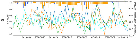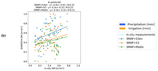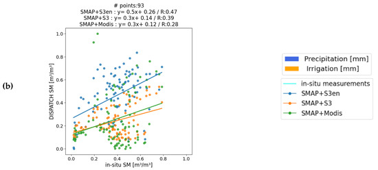 Figure 3 shows the time series (with in situ and remotely sensed SSM products) and scatter plot for the Foradada site during 2017. It is noticeable that, in the winter periods, all three disaggregated datasets correctly retrieved the precipitation events (blue bars in Figure 3a), showing the peaks of SSM where large precipitation events were present. At the same time, only SMAP + S3en showed an increase in SSM corresponding to irrigation events in summer (orange bars in Figure 3a). The improvements in spatial resolution of the 20 m SMAP + S3en product showed the ability to detect irrigation events, which, in this case, happened at a very limited spatial scale. All the products were able, instead, to successfully detect precipitations, since they are spatially larger events that can be recognized at coarser resolutions.