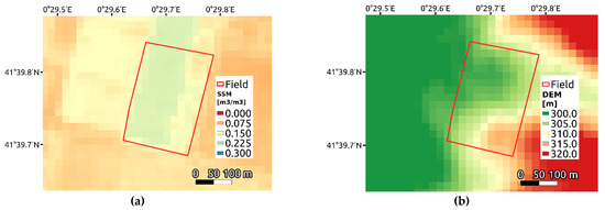 The very high resolution of the SMAP + S3en product presents the capability of showing local differences in SSM at sub-field scale. For the case of the Raimat field, it is noticeable how the estimated SSM was able to capture two different SSM conditions within the same field. As shown in Figure 5a, the east side of the field showed a pronounced lower SSM than the west part. These spatial differences were already observed while conducting the experimental field campaign [36] and can be explained by the topographic differences present in the area. The Raimat field presents a pronounced slope that leads water to runoff towards the west side, as seen from Figure 5b, which shows the 30 m SRTM DEM data. Figure 5a shows the average SSM derived from SMAP + S3en, during the irrigation period.