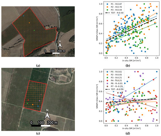 Sub-field scale correlation analysis: (a) position of the three in situ sensors in the Foradada field and pixel sizes of the SMAP + S3en SSM product. (b) Scatter plot of SMAP + S3en SM data at pixel level vs the in situ data for each single sensor for the Foradada field. (c) Position of the six in situ sensors for the Raimat field and pixel sizes of the SMAP + S3en SSM product. (d) Scatter plot and correlations for each location of the sensors for the Raimat field.