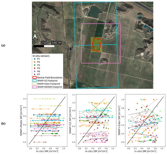 Spatial analysis for the field in Raimat. (a) Footprints of the different pixel sizes of the product used. For the case of SMAP + MODIS (pink), a single pixel covers the entire area, showing the same value for the six different sensors, while in the case of SMAP + S3 (cyan) the sensor in position P7 is covered by a different pixel. SMAP + S3en (yellow) has a finer resolution where each pixel covers a different sensor. The six points representing the sensors’ positions have been magnified for the sake of visibility, each of them is actually contained in a 20 m by 20 m SMAP + S3en pixel. (b) Spatial correlation for each available day for the 3 different products, SMAP + MODIS, SMAP + S3 and SMAP + S3en.