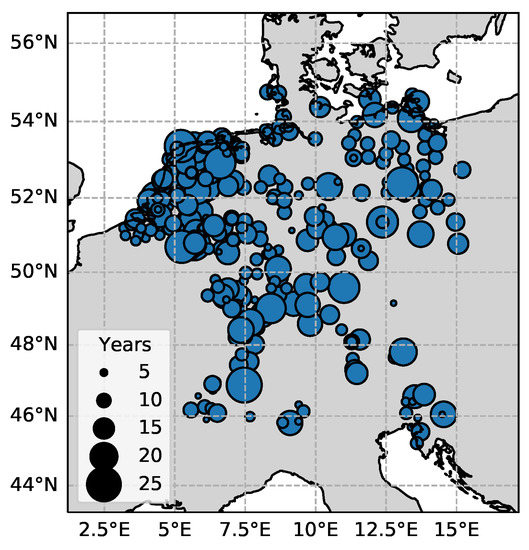 The Nevada Geodetic Laboratory (NGL) collects data from all available geodetic GNSS stations worldwide and makes their station position solutions publicly available [23]. For this work, the 24-h final solutions in the area of central Europe are used, where a network of stations with a nearby meteorological station is available (see Section 2.3). The dataset has daily sampling, ranging from January 1994 to October 2020. Only the stations that have a time span of minimum 3.5 years and not more than 20% of missing observations are used. Figure 1 shows the distribution and data availability of the selected NGL stations. The raw data files were downloaded from NGL (http://geodesy.unr.edu/index.php, accessed on 13 November 2020) in tenv3 format and further processed in the software package Hector [24]. Outliers are removed, and discontinuities are detected and corrected for. Then, a linear trend is fitted and subtracted, resulting in the detrended and cleaned signal.