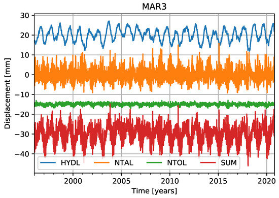 The vertical displacements, caused by environmental surface loadings (HYDL, NTAL, NTOL), are available from the Earth System Modeling Group Repository of Deutsche Geoforschungszentrum Potsdam (ESMGFZ) [25]. All loadings are stored in a regular 0.5× 0.5 grid, and, while HYDL is provided in 24 h sampling, NTAL and NTOL have a 3 h sampling rate. First, NTAL and NTOL are downsampled to 24-h observation spacing by taking the daily average. In a next step, to reduce the GNSS residuals by the loading data, their values on the exact station positions are needed. These are derived from the grid by conducting a bilinear interpolation. Additionally, all resulting HYDL time series are reduced by a second-order polynomial fit, in order to correct for a second-order long-term trend, appearing at some stations. In Figure 2, the final individual loadings, as well as the sum of them, are depicted for the example station MAR3. More details about the preprocessing of the environmental surface loadings, as well as of the GNSS height residuals described in the previous section, can be found in Reference [26].