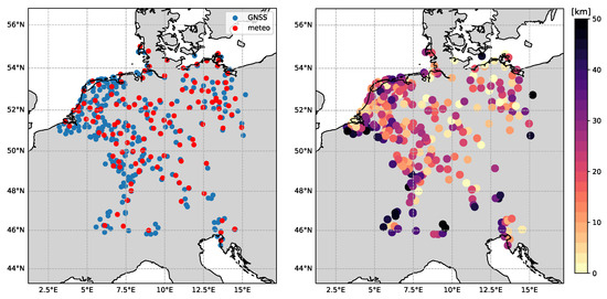 (Left) GNSS and meteorological station locations. (Right) GNSS station locations, colored by the distance to the corresponding meteorological station.