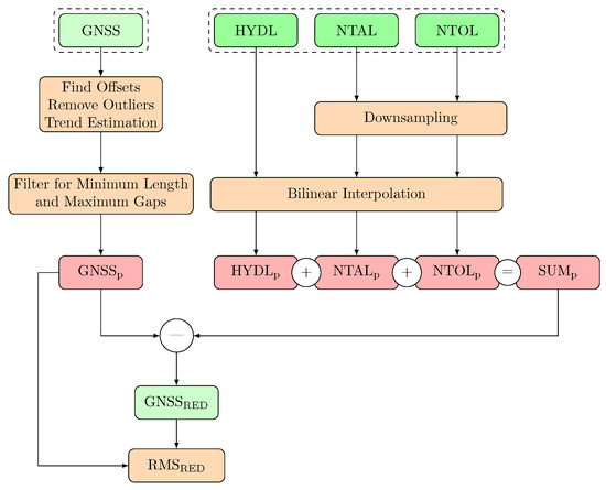 In Figure 5, an overview of the processing steps for the reduction of GNSS residuals by environmental surface loadings is shown. The original time series (GNSS and environmental loadings) are processed individually, according to the steps highlighted in the orange boxes, to and . The sum of the processed loading time series is then subtracted from , resulting the the reduced GNSS residuals . From and , the Root Mean Square reduction is computed. In Figure 6, the different processing steps are shown on one example station (MAR3) from the raw data to the loading reduced residuals. Figure 7 shows the spatial distribution and histogram of the achieved RMS reductions for all GNSS stations that were later used as test stations for the machine learning algorithm.