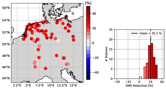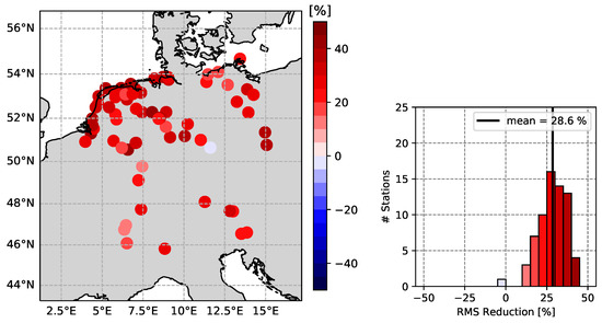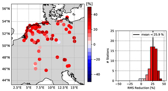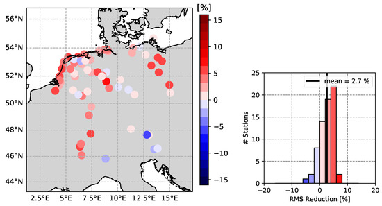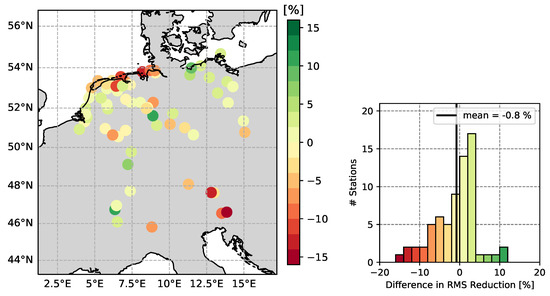 The additional RMS reduction of the GNSS residuals is computed, as well, and is depicted in Figure 16. The achieved additional RMS reduction is, on average, 2.7%. Overall, the RMS of 84% of the stations could be further reduced.