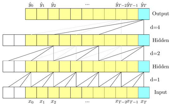 - all convolutions are causal; therefore, can only depend on , and not any future inputs [29,31]. In Figure 8, the principle of dilated causal convolutions is depicted.