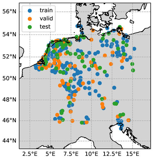 After the previously described pre-processing steps (selection of stations and reduction by environmental surface loadings), all remaining datagaps are filled by linear interpolation over the whole time series. Overall, 342 stations are selected, from which 60% (206 stations) are used for training, 20% (68 stations) for validation, and 20% (68 stations) for testing. This ratio was adopted due to its wide use in literature and additional tests, that indicated better performance when increasing the number training stations. All stations were allocated randomly to the subsets. Figure 9 shows the spatial distribution of the station categories. The input features per station are all meteorological parameters (temperature, precipitation, sea level pressure, humidity, and radiation), as well as location information (latitude, longitude, and height) in the form of constants over the whole time series. Both the input feature matrix and the target vector are scaled between 0 and 1 for the training of the network, and the results are scaled back to the original range again for analysis. Each training sample is represented by a sequence of F features, which can be represented as a matrix of size (FxT), with F being the number of Features, and T the time. During training, samples are grouped in batches of size B, leading to a 3-dimensional object of size (BxFxT), where B is the number of elements in the batch. In Table 1 below, the utilized parameter values can be found, which were determined empirically. The TCN is implemented in Python, based on Bai et al. [29], and a GitHub repository (https://github.com/philipperemy/keras-tcn, accessed on 11 December 2020).