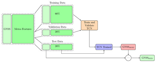 Figure 10 gives a schematic overview of the training, validation, and testing of the TCN. After dividing the dataset into its subsets, the TCN is trained on the meteorological parameters as input features, and the GNSS residuals as target features. In the validation, the meteorological parameters from the validation dataset are put through the TCN and then compared to the validation GNSS residuals to get a measure of how well the TCN is performing, as well as given information on the ability to generalize. When the model is sufficiently trained, the meteorological time series of the test dataset are used to model the GNSS time series GNSSMOD. These are subtracted from the corresponding GNSS residuals from the test dataset, which results in the reduced GNSS time series GNSSRED.