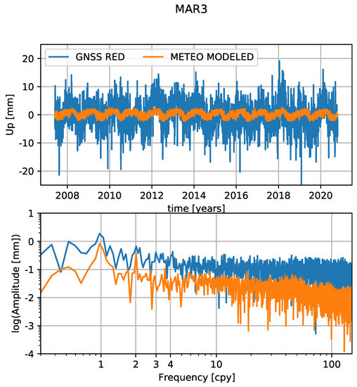 Figure 14 shows the results of the TCN-modeled time series, at MAR3. Similar to the results of the previous section (Figure 11), the seasonal patterns are very strong in the modeled signal. The annual peak is here even more distinct. The patterns of the underlying GNSS residuals are also different, as the environmental loadings were already subtracted. An interesting observation concerns the amplitude of the annual signal. Despite a smaller RMS variation overall, the annual peak is higher compared to the original GNSS residuals. This is due to a stronger annual signal in the environmental loading, mainly introduced by HYDL. HYDL has a clear annual pattern, which is, at most stations, not entirely in phase with the GNSS residuals. Phase differences between HYDL and GNSS have been quantified and discussed in several studies [34,35,36]. The reasons found are diverse and mostly trace back to local phase-inhomogeneities of surface water and the absence of a model for groundwater storage, but no correction models are proposed. Only recently, Michel et al. [37] made an attempt to model and correct for a misinterpretation of horizontal fluxes, which leads to an improvement of the phase advance over the GNSS seasonal signal. In our work, phase deviations are not corrected; therefore, the annual signal is inflated for some stations. These seasonal peaks get reduced by the TCN-modeled signal to a lower level than the original GNSS residuals. The different stages of reduced GNSS time series are shown in Figure 15.