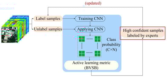 Additionally, some scholars have successfully applied AL and deep learning in HSI classification [,,]. More specifically, Liu et al. [] proposed an active learning algorithm based on weighted incremental dictionary learning. Haunt et al. [] introduced an AL-guided classification model by using spectral and spatial context information from hyperspectral data in a New Bayesian CNN. Furthermore, Cao et al. [] have suggested that high classification accuracy, of different landmarks in hyperspectral images, can be achieved by applying the powerful feature extraction capability of CNNs, as well as the effective labeling efficiency of AL.