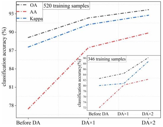 Classification, before and after DA operation, under 346 and 520 training samples.