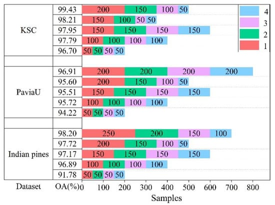 The Indian pines dataset analysis indicates that the classification accuracy tended to increase with the increase in unlabeled samples. Overall, a good classification result of 98.20% was achieved when 250, 200, 150, and 100 samples were added to the training set. However, for the Pavia University dataset, with the increase in unlabeled samples, the third experiment and the fourth experiment did not provide higher classification results. By adjusting the number of samples added at each time to 200, the experiments provided higher classification accuracy, which alleviated the mislabeling problem. This problem was driven by the semi-supervised algorithm when labeling unlabeled samples. For the KSC dataset, the number of samples added in each round was determined to be 200, 150, 100, and 50, while the classification accuracy reached 99.43%.