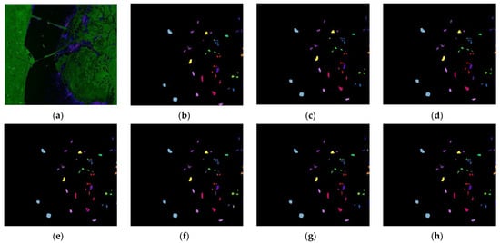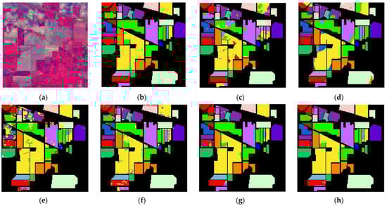 Indian Pines dataset Classification: (a) False color image, (b) Ground-truth map, (c) EPF, (d) IFRF, (e) RPNET, (f) CNN-AL, (g) SS-RMG, and (h) Improved-ADL.