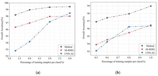 Curves of overall accuracies versus different percentages of training samples, obtained by different methods on two datasets: (a) Indian Pines dataset, (b) Pavia University dataset.