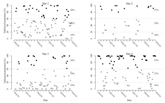 Time series valid pixel proportion (%) for the four sites: Site 1 (Taita Taveta, Kenya), Site 2 (Pirkanmaa, Finland), Site 3 (Brandenburg, Germany), and Site 4 (Tibet, China). The horizontal dashed line shows the 20% and 60% level. The unfilled circles are images that have valid pixel percentage under 20%; grey filled circles are images that have valid pixel percentage between 20% and 60%; black filled circles are images that have valid pixel percentage over 60%. The percentage of images for each level is shown on the right side of each panel. Images that were entirely covered by clouds and cloud shadows are not shown.