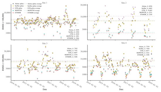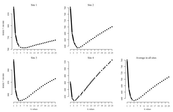 RMSE (multipled by 100,000) with respect to the k value ranging from 1 to 25 is shown in Figure 4. All sites had a strict convex shape of RMSE with an increase in k value. Thus, the curves showed a steep decrease when k started from one to three and reached the bottom of a trough before rising. The best k values, corresponding to the minima in RMSE, were 7, 5, 5, and 3 for Sites 1–4, respectively. Based on all four sites, the average RMSE was minimized when k was five.