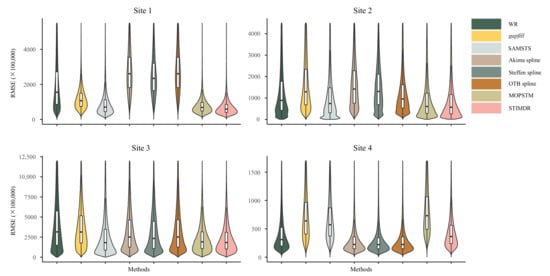 Eight gap-filled results are compared in Figure 5, and their pixel-based RMSE values are displayed in Supplementary Figure S3. In general, STIMDR produced the smoothest and most natural-looking reconstructed images. MOPSTM was the second best on average, although it produced artifacts when recovering stripe-shaped gaps for Site 4. SAMSTS performed better than all methods other than MOPSTM and STIMDR but rendered noisy pixels (e.g., in Site 3). The three temporal interpolation methods produced similar results. WR and gapfill could not recover all the gaps, especially the large-area gaps. gapfill only recovered all the gaps for Site 1, and it performed more accurately than WR and the temporal interpolation methods. WR was the worst, only recovering adjacent pixels around the valid pixels but producing extreme large or small values.