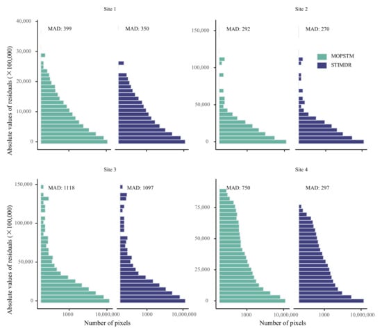 To better summarize how the STIMDR results have improved over MOPSTM, we compared the histogram of absolute residuals and the median absolute deviation (MAD) [,] of these two methods. The absolute values of residuals are the absolute difference between the filled values and the actual values in each band; MAD is defined as the median of the absolute deviations from the median of the data and is a robust estimator of dispersion, better at highlighting differences in non-parametric data distribution.