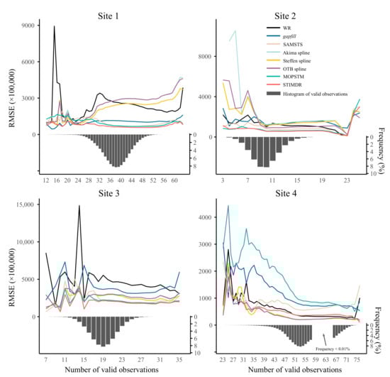 As the number of the observations per pixel location throughout time series can be a driver behind overall RMSE, we examined how the RMSE relies on the number of observations using different gap-filling methods. The pixels were from the common regions that have been filled by these methods.