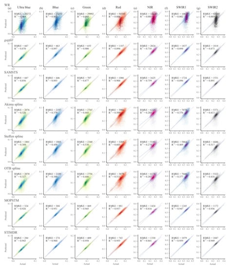 We compared our method, STIMDR, with four hybrid methods (WR, gapfill, SAMSTS, and MOPSTM methods) and three temporal interpolation methods (a non-rounded Akima spline, Steffen spline, and OTB spline methods). The performance of SAMSTS and MOPSTM has been compared in the previous work [].