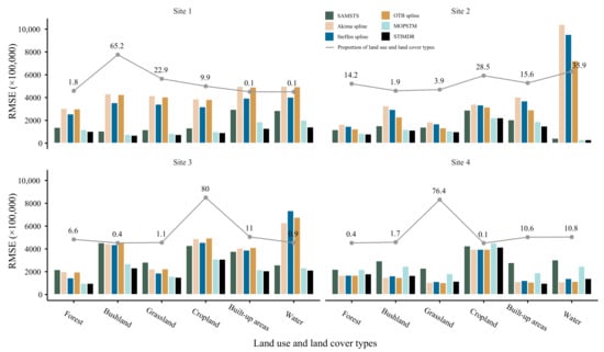 To assess the algorithms’ performance on different LULC types, we evaluated RMSE for the different methods over six LULC types, including forest, bushland, grassland, cropland, built-up areas, and water. The reference data were the same datasets that were used in the previous studies [].