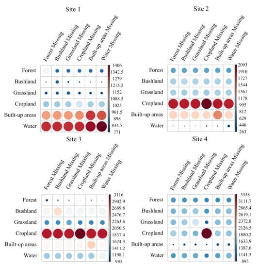 To examine the accuracy variation of STIMDR with respect to its sensitivity to LULC type imbalance, we demonstrated RMSE for six LULC types given that one specific LULC type was missing in the training datasets. We randomly selected 1000 pixels from every LULC type, and thus there were a total of 6000 pixels. The 10-fold cross-validation was applied to the datasets. We eliminated pixels from one specific LULC type in the training datasets while predicting the test datasets which had pixels from all LULC types. The specific missing type is from the six LULC types in order. To obtain stable accuracy, we repeated the experiments 10 times.