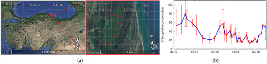 (a) The study area in North Turkey at the Kizilirmak Delta ( N, E); red dots denote measurement positions. (b) The Chl-a concentration distribution of our dataset across time. Each point in the plot denotes the average of 10 measurement sites, while the vertical bar represents the value range across locations; mean = 35.82 g/L, standard deviation = 19.43 g/L, minimum = 11.04 g/L, and maximum = 108.35 g/L.