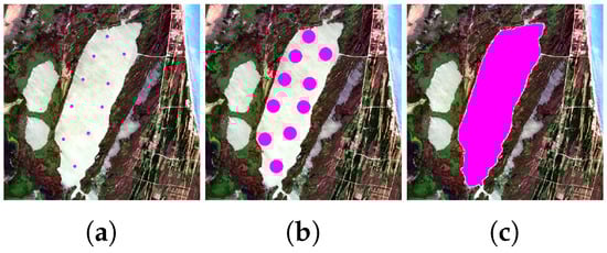 The pink regions denote the unlabeled samples used in our ablation experiments; centered on each of the in situ sampling positions with (a) a disk of diameter 11 pixels, (b) a disk of diameter 45 pixels, and (c) the entire lake surface, yielding 28,160, and 503,040, and 2,364,928 unlabeled samples in 32 images, respectively.