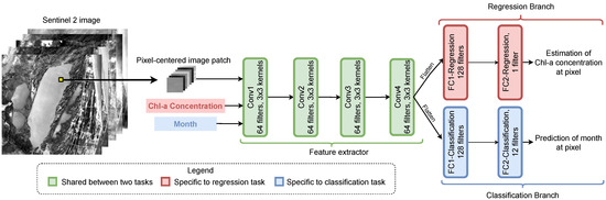 Instead, a superior alternative is to train the network’s feature extractor for both tasks simultaneously as a multitasking network (Figure 3), where the main task is Chl-a regression and the auxiliary task is month classification. The two tasks form the two branches following the feature extraction layers, and direct the network to learn features useful for both tasks, thus reinforcing each other. Moreover, being able to benefit from the often far greater amount of unlabeled data in this way can have a strong regularization effect, thus avoiding overfitting.