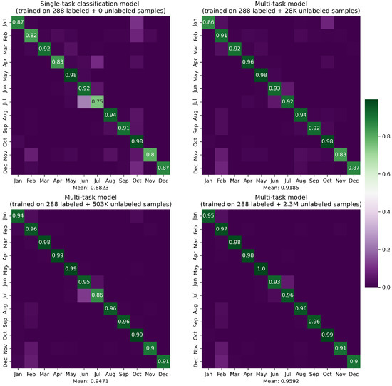 The effect of the number of unlabeled samples on the auxiliary classification task was also examined. Similarly to the previous ablation for Chl-a estimation, four models were trained with an increasing number of unlabeled samples using the same lake intermediate masks as in Figure 2a–c. Likewise, the multitask learning model trained using all possible samples achieved the best performance, and their confusion matrices are shown in Figure 5.