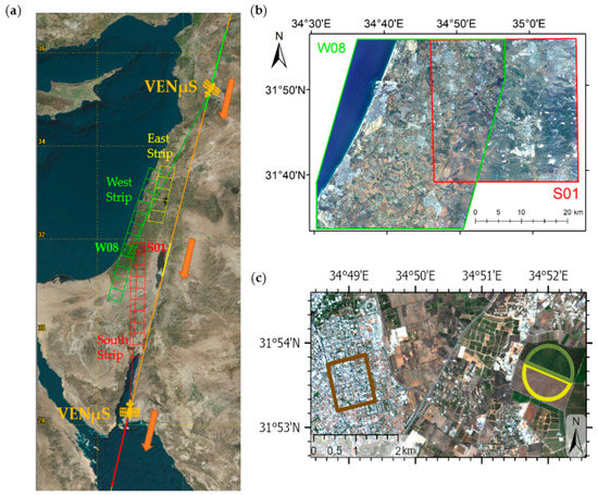 (a) Spatial distribution of the three VENμS strips over Israel; (b) the overlapping zone of the VENμS tiles, located in the S01 (red) and W08 (green); (c) the three selected polygons of Urban (brown), CircleField-N (green), and CircleField-S (yellow).