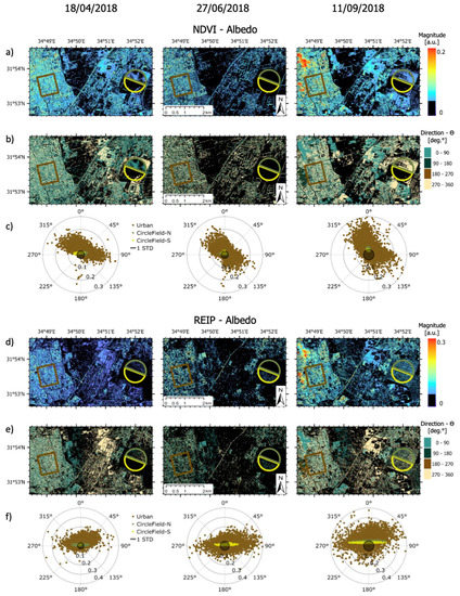 Change vector analysis (CVA) of NDVI-albedo (a,b), and (c) and REIP-albedo (d,e), and (f) for the three dates (i.e., 18 April, 27 June, and 11 September 2018). (a,d) Magnitude maps calculated by Equation (6). (b,e) Direction maps calculated by Equation (6); the colors are based on Figure 2. Pixels colored in black have magnitude values smaller than the one standard deviation (1-STD) threshold, determined as no-change pixels. (c,f) Polar plots illustrating the changed magnitude (i.e., distance from the center) and changed direction (i.e., degree angle between 0° and 360°) value distribution for the three dates and the three polygons (i.e., Urban, CircleField-N, CircleField-S), colored in brown, green, and yellow, respectively. The color of each point matches the color of its polygon; black circles mark the areas below 1-STD-presented as black (a,b,d,e).