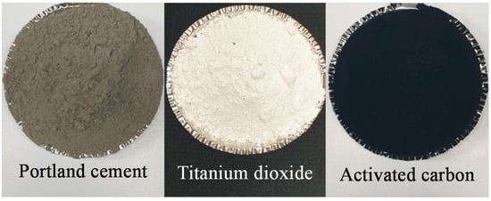 Portland cement, TiO2 (titanium dioxide), and activated carbon were used as basic mixing materials to fabricate the specimens (Figure 1). For the cement material, we used ordinary Portland cement powder with a specific gravity of 3.14, a specific surface area of 4030 cm2/g, and an average particle size of 11.76 μm. For TiO2, we used the Anatase series with an average particle size of 0.30 μm and purity of 99%. The activated carbon used in this study had a purity of 90% and contained some quartz (SiO2).