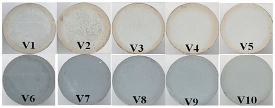 The cement specimens were cured in the laboratory for 14 days. During the curing process, the specimens were sealed to prevent moisture evaporation. The temperature and humidity were maintained at 20.5 ± 0.6 °C and 61.9 ± 2.0%, respectively. After curing, the measurement surfaces of the specimens were again polished using abrasive sandpaper. Figure 3 shows the surfaces of the cured specimens for algorithm verification.