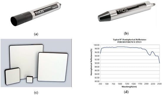 (a) RAMSES ARC-VIS, (b) RAMSES ACC-VIS, (c) Spectralon white reference panel, and (d) reflectance of the white reference panel.