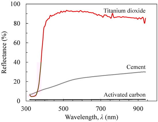 Figure 6 presents the reflectance spectrum of the three raw materials (powder type). Consistent with naked-eye observations, TiO2 had the highest level of reflectance among the three materials and activated carbon had the lowest. A notable reflectance characteristic of TiO2 is the dramatic reduction in reflectance in the UV spectral range (300–400 nm), where the reflectance decreases from 80%–95% in the visible range to 10% at around 320 nm. Cement exhibits gradually increasing reflectance by wavelength with the reflectance reaching almost 30% at the near-infrared range, around 900 nm. Carbon exhibited a reflectance in the range of 1%–2% across the entire wavelength range tested.