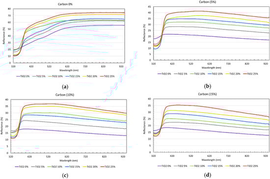 Reflectance curves of cementitious base samples with varying TiO2 contents. Each subfigure corresponds to a different carbon level: (a) 0%, (b) 5%, (c) 10%, and (d) 15%.