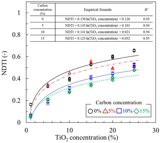 Figure 8 presents scatter plots of TiO2 concentration (%) versus NDTI for different carbon levels. Given a constant NDTI value, the overall TiO2 concentrations were higher for higher carbon levels. This is because the overall reflectance level decreases with more carbon contained in the samples. Therefore, the estimation of TiO2 concentration using NDTI requires adjustments according to carbon level. A regression with the quadratic polynomial reveals that a nonlinear relation can be established with a high correlation between TiO2 concentration and NDTI when the carbon content is fixed or known a priori. Since the carbon content acts as a reflectance reducer, NDTI—which is the measure of the reflectance dip—decreases as carbon contents increase. For example, for the same TiO2 concentration of 25%, the NDTI values corresponding to the carbon levels of 0%, 5%, 10%, and 15% are approximately 0.60, 0.54, 0.46, and 0.40, respectively. The correlation is high, except in the case of a carbon level of 5%, which was close to one.
