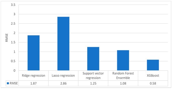 Figure 11 presents the root-mean-square-error of the tested methods. Note that the unit (i.e., percent) is from the unit of the independent variable—namely, the TiO2 concentration itself—and does not indicate the relative accuracy as a ratio to any other reference value, such as the mean of the estimates. Among the five methods, XGBoost performed the best, producing an RMSE of 0.6%, whereas the worst-performing model was Lasso regression, as shown by its RMSE of approximately 3%. Considering the tested TiO2 concentrations, which ranged from 0% to 25%, models with an RMSE of less than 1% can be regarded as having high estimation precision.
