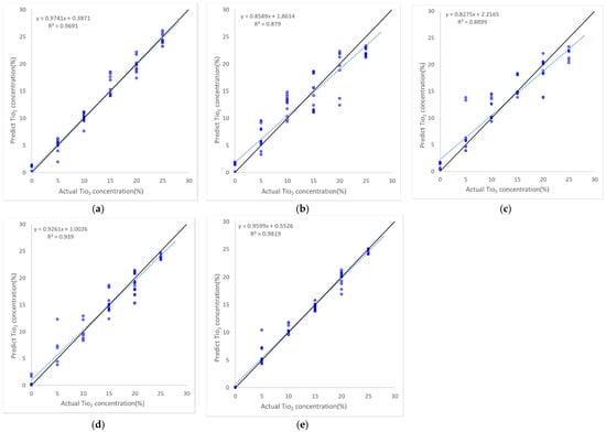 Scatter plots of the TiO2 estimation performance for Dataset II of the five machine learning algorithms; (a) Ridge regression; (b) Lasso regression; (c) Support vector regressor; (d) Random Forest Ensemble; (e) XGBoost. The 1:1 line is in black, and the blue dashed line represents the regression line fitted to actual and predicted TiO2 concentrations.