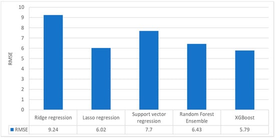 To derive more generalized results in terms of the performance of the five machine learning algorithms, the trained algorithms were applied to the independent test data (Dataset II). Figure 13 reveals that the results from the test data were generally worse than those obtained using the validation dataset, regardless of the method. This is typical of the training and test process of machine learning approaches. In terms of uncertainty, XGBoost again produced the best RMSE (around 6%), whereas the ridge regression method exhibited the worst result with an RMSE of approximately 9%. The other methods exhibited RMSE values of around 6%–8%.