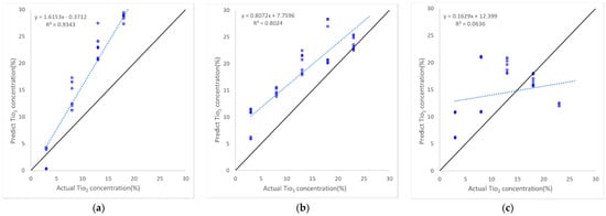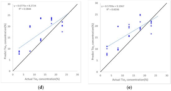 The scatter plot of each method provides additional insights into the performance of the model that cannot be represented by RMSE (Figure 14). In contrast to the performance as analyzed by RMSE, where Ridge regression had the lowest performance among the five methods, in terms of correlation, the Ridge regression exhibited the best R2 (around 0.93). However, this method exhibited large TiO2 biases for concentrations greater than 10. Lasso regression had the most stable performance with an RMSE of around 6% and an R2 of approximately 0.8, despite the consistent overestimation observed throughout the entire range. XGBoost exhibited a similar RMSE level to Lasso but, as represented by its R2 score, the scatter was greater than that of the Lasso regression method. Lastly, support vector regression produced the lowest R2 (<0.1); however, its RMSE result of around 8% is not overly poor when compared with the other methods. This indicates that RMSE alone does not represent the performance of the method.