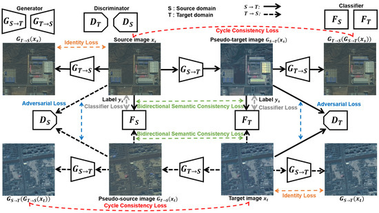 In typical domain adaptation problems, the distributions of the source domain are different from those of the target domain. In remote sensing, we assume that the images collected from different satellites or locations (cities) are different domains. The unsupervised domain adaptation defines that only annotations of the source domain are available and aims at generating satisfactory predicted labels for the unlabeled target domain, even if the domain shift between the source domain and target domain is huge. To improve the performances of the segmentation models in aforementioned settings, one of the most common approaches in remote sensing is to diversify the training images of the source domain, by performing data augmentation techniques, such as random color change [9], histogram equalization [10], and gamma correction [11]. However, even if these methods slightly increase the generalization capabilities of the models, the improvement is unsatisfactory when there exists huge differences between the distributions of different domains. For example, it is difficult to adapt the classifier from one domain with near-infrared, red, and green bands to another one with red, green and blue channels by using simple data augmentation techniques. To overcome such limitation, a generative adversarial network [12] was applied to transfer images between the source and target domains and made significant progress in unsupervised domain adaptation for semantic segmentation [13,14]. These approaches based on image translation can be divided into two steps. At first, it learns to transfer the source images to the target domain. Secondly, the translated images and the labels for the corresponding source images are used to train the classifier which will be tested on the unlabeled source domain. When the first step reduce the domain shift, the second step can effectively adapt the segmentation model to the target domain. In addition, inverse translations which adapt the segmentation model from the target domain to the source domain have been implemented as well [15]. In our experiments, we find that these two translations in opposite directions should be complementary rather than alternative. Furthermore, such unidirectional (e.g., source-to-target) setting might ignore the information from the inverse direction. For example, Benjdira et al. [16] adapted the source classifier to the unlabeled target domain, they only simulated the distributions of the target images instead of making the target images fully participate in domain adaption. Therefore, these unidirectional methods cannot take full advantage of the information from the target domain. Meanwhile, the key to the domain adaptation methods based on image translation is the similarity between the distributions of the pseudo-target images and the target images. Given fixed image translation models, it will depend on the difficulty of converting between two domains: there might be some situations where transferring the target images to the source domain is more difficult, and situations where transferring the source images to the target domain is more difficult. By combining the two opposite directions, we will acquire an architecture more general than those unidirectional methods. Furthermore, the recent image translation network (e.g., CycleGAN [17]) is bidirectional so that we can usually obtain two image generators in the source-to-target and target-to-source directions when the training of the image translation model is done. We can use both of generators to make the best of the information from the two directions.
