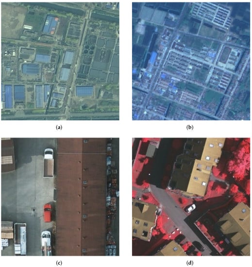 For the semantic segmentation of remote sensing images, CNN [4] has become one of the most efficient methods in the past decades and several CNN models have shown their effectiveness, such as DeepLab [5] and its variants [6,7]. However, these methods have some limitations, because CNN-based architectures tend to be sensitive to the distributions and features of the training images and test images. Even though they give satisfactory predictions when the distributions of training and test images are similar [1], when we attempt to use this model to classify images obtained from other satellites or cities, the classification accuracy severely decreases due to different distributions of the source images and target images, as shown in Figure 1. In the literature, the aforementioned problem is known as domain adaptation [8]. In remote sensing, domain gap problems are often caused due to many reasons, such as illumination conditions, imaging times, imaging sensors, geographic locations and so on. These factors will change the spectral characteristics of objects and resulted in a large intra-class variability. For instance, the images acquired from different satellite sensors may have different colors, as shown in Figure 1a,b. Similarly, due to the differences of the imaging sensors, images may have different types of channels. For example, a few images may consist of near-infrared, green, and red channels while the others may have green, red, and blue bands.
