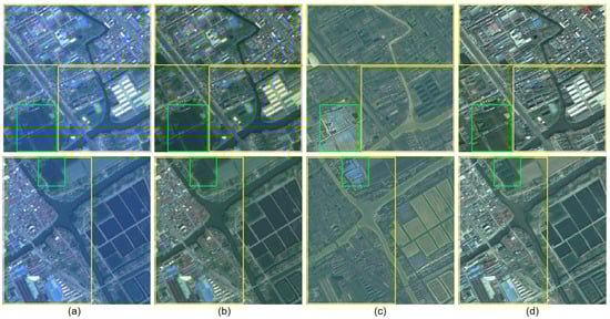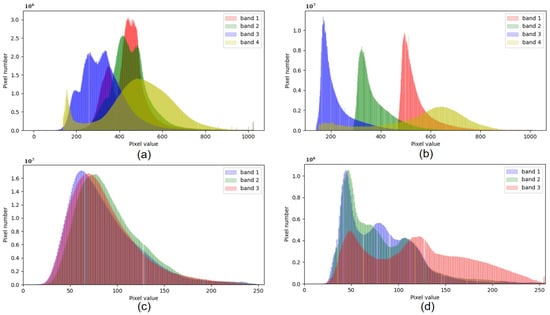 In terms of the Gaofen data set, the same objects (e.g., buildings) have similar structures, but the colors of the GF-1 satellite images are different from the colors of the GF-1B satellite images as shown in Figure 7a,b. What’s more, we depict the histograms to represent the data distributions of the two datasets. There are some differences between the histograms of the GF-1 satellite images and the GF-1B satellite images as shown in Figure 8a,b.