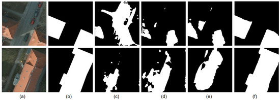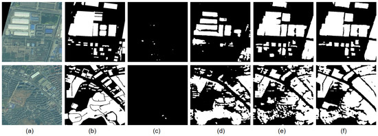 The Gaofen dataset consists of the Gaofen-1 (GF-1) satellite images and the Gaofen-1B (GF-1B) satellite images, which are civilian optical satellites of China and equipped with two sets of multi-spectral and panchromatic cameras. We reduce spatial resolution of the images to 2 m and convert the images to 10 bit. The images from both satellites contain 4 channels (i.e., red, green, blue and near-infrared). The labels of buildings are provided. We assume that only the labels of the source domain can be accessed. We cut the images and their labels into 512 × 512 patches. Table 1 reports the number of patches and the class percentages belonging to each satellite. Figure 7a,b show samples from the GF-1 satellite and the GF-1B satellite.