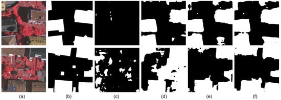 This ISPRS dataset includes aerial images acquired from [61,62], which have been publicly available to the community. The Vaihingen dataset consists of images with a spatial resolution of 0.09 m and the spatial resolution of Potsdam dataset is 0.05 m. The Potsdam images contain red, green and blue channels while the Vaihingen images have 3 different channels (i.e., red, green and infrared). All images in both datasets are converted to 8 bit. Some images are manually labeled with land cover maps and the labels of impervious surfaces, buildings, trees, low vegetations and cars are provided. We cut the images and their labels into 512 × 512 patches. Table 1 reports the number of patches and the class percentages for the ISPRS dataset. Figure 7c,d show samples from each city.