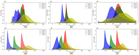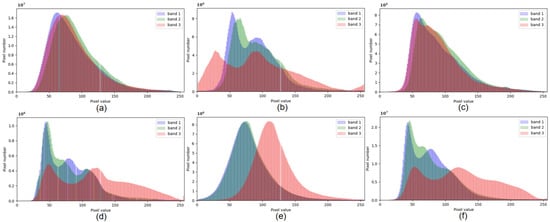 Color histograms of the Gaofen dataset. (a) GF-1. (b) Pseudo GF-1 transformed by color matching. (c) Pseudo GF-1 transformed by BiFDANet. (d) GF-1B. (e) Pseudo GF-1B transformed by color matching. (f) Pseudo GF-1B transformed by BiFDANet.