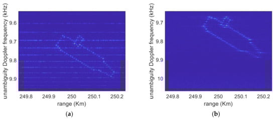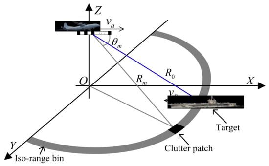 For airborne battlefield surveillance radars, it is challenging to obtain high-resolution radar images of moving targets in the scenario of strong clutter interference. Inverse synthetic aperture radar (ISAR) imaging is generally applied with a fixed platform by utilizing the relative motion of a non-cooperative target [,,], which is supposed to be effective in the absence of strong clutter interference. However, in an airborne radar system, the Doppler spread of strong clutter is inevitable due to the geometry-induced spatial-temporal frequency coupling effect. Furthermore, this Doppler spread issue will be aggravated in the airborne ISAR system, because of the large carrier frequency employed for the azimuth Doppler frequency distinction among scatters in the ISAR image. Hence, it is difficult to separate the slow-moving maritime target signal from clutter interference with the conventional pulse-Doppler based radar. Space−time adaptive processing (STAP) algorithms have been widely applied for clutter suppression and low-altitude slow moving target detection in airborne radar systems [,,], where the weight vector basically consists of a whitening operation followed by a spatial-temporal two-dimensional (2D) match filter. However, it is difficult to apply the STAP directly in the ISAR system. The challenges lie in two aspects: (i) the transmitted bandwidth and the coherent processing interval (CPI) are each increased to improve range-Doppler (R-D) resolutions in the ISAR image, which cause the nonstationary echo signal in regard to the range walking (RW) of target and clutter, leading to the unsatisfied requirement of STAP and the corresponding clutter suppression performance degradation [] and the target coherent accumulation performance loss [,,,], and (ii) the large-scale maritime target becomes an range-extended target in the high-resolution ISAR system, leading to target output power loss and to corresponding target detection performance degradation of STAP.
