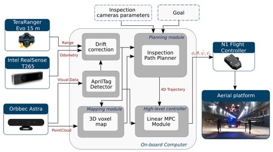 Despite these advantages, the lack of Global Navigation Satellite Systems (GNSS) signals, the poor lighting conditions, the highly symmetrical environment, as well as the presence of the catenary in railway tunnels pose several challenges in terms of localization and navigation performance of an autonomous aerial vehicle. Thus, many of the current commercial solutions are either semi-autonomous or require an expert pilot to command the aircraft. Recently, a coordinated effort around the Defense Advanced Research Projects Agency (DARPA) Subterranean Challenge has pushed the limits of autonomous navigation of aerial robots in confined, tunnel-like environments [,,]. Examples of this can be found in [], where the authors combine a local and global planning strategy to autonomously navigate with both legged and aerial vehicles through a complex subterranean environment, as well as in [], where a risk-aware planning method is proposed to account for the degradation of perception modules which occurs in long and complex missions. Despite the progress made, these works focus mainly on exploratory goals, leaving aside the inspection objectives required by infrastructure maintainers and operators.